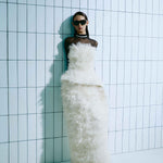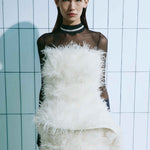 Вечірня сукня з пір’ям у відтінку айворі — це поєднання високої моди, витонченої жіночності та сучасної архітектурної естетики. Багатошарова фактура з декоративним пір’ям створює об’ємний силует, який підкреслює рух і додає образу драматичної елегантності.