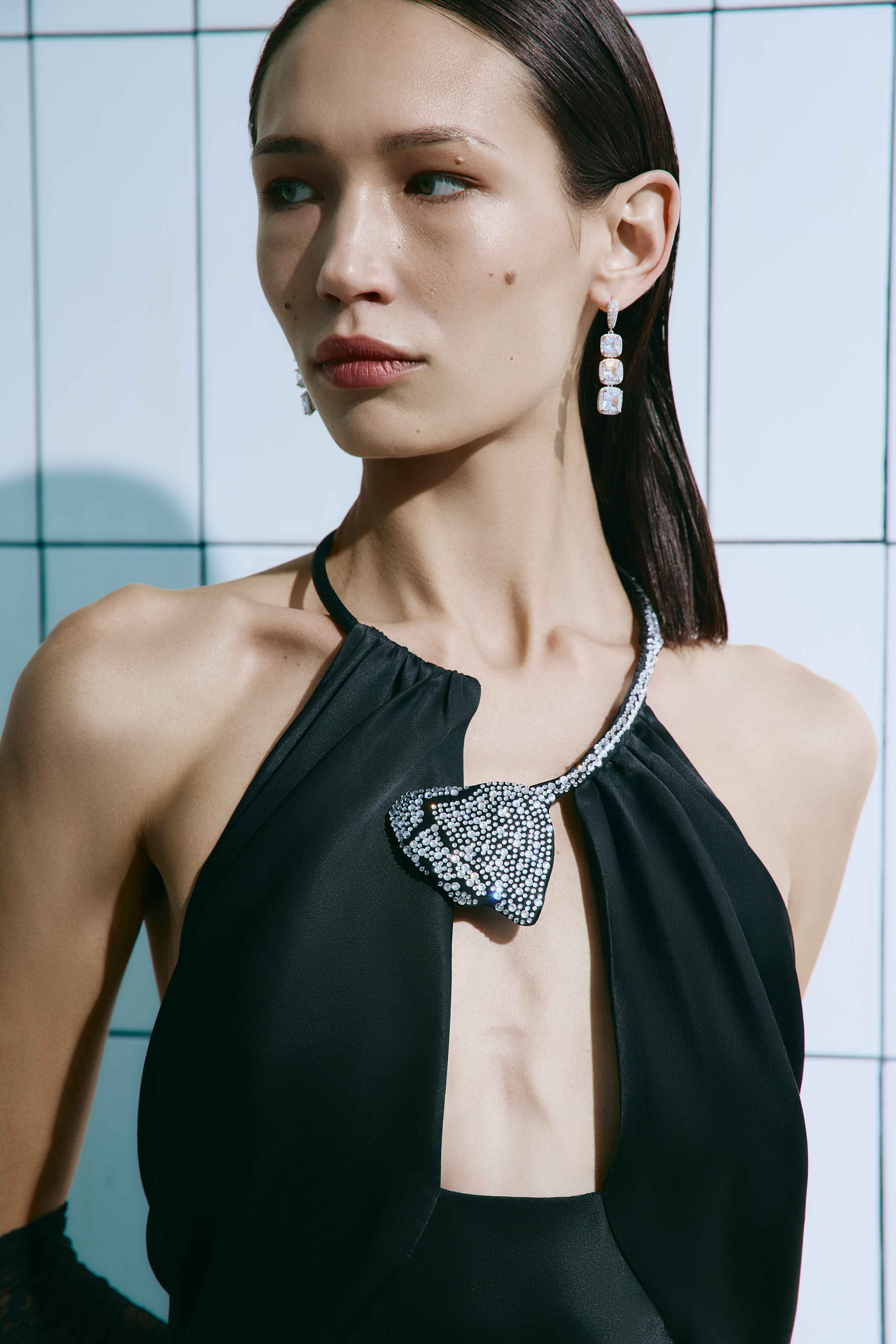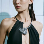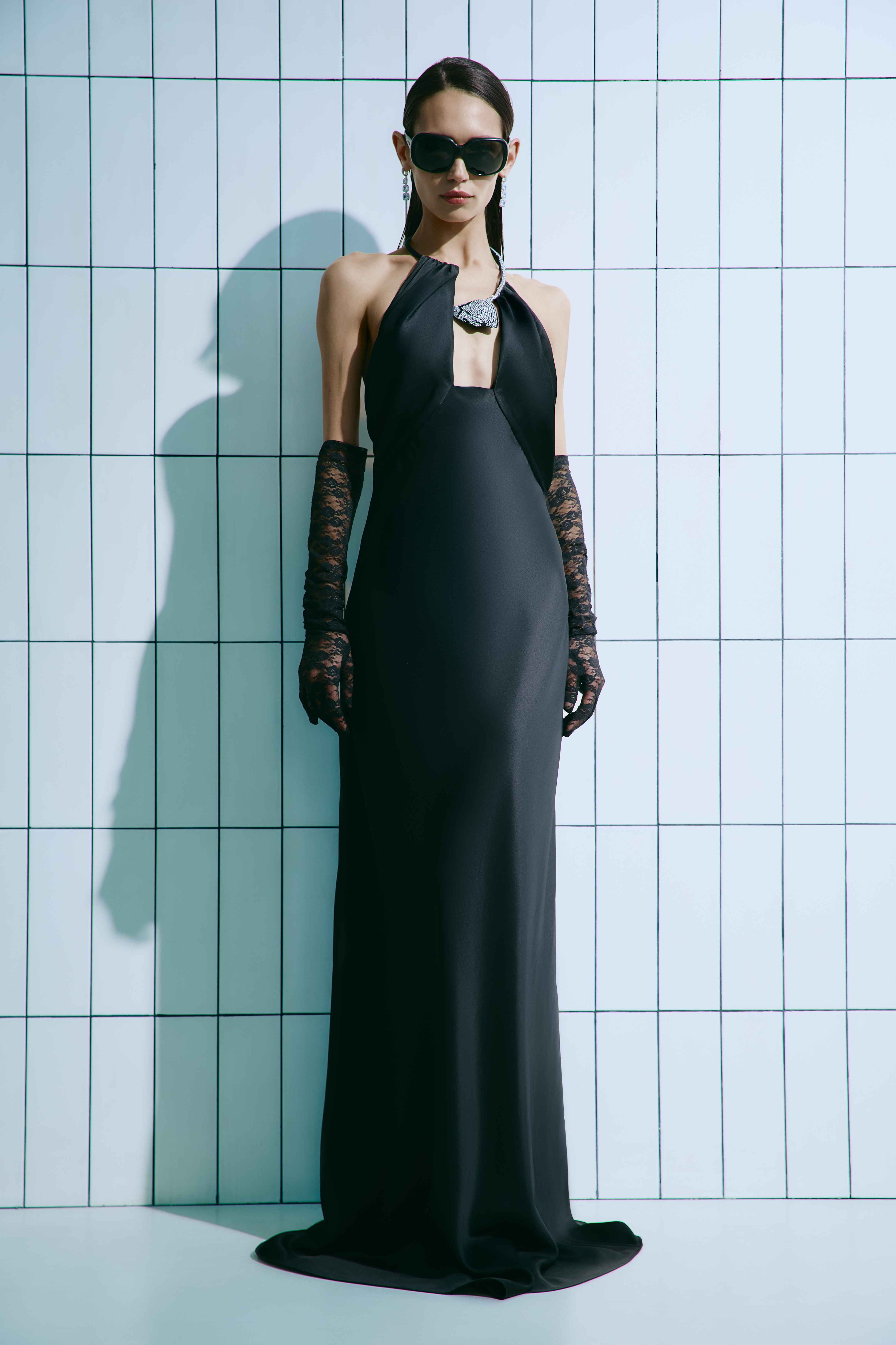 Чорна вечірня сукня halter — витончене поєднання сучасної елегантності та мінімалістичного дизайну. Відкрита зона плечей і акцентна кристальна прикраса на шиї формують виразний силует, який підкреслює лінію декольте та додає образу вишуканості.