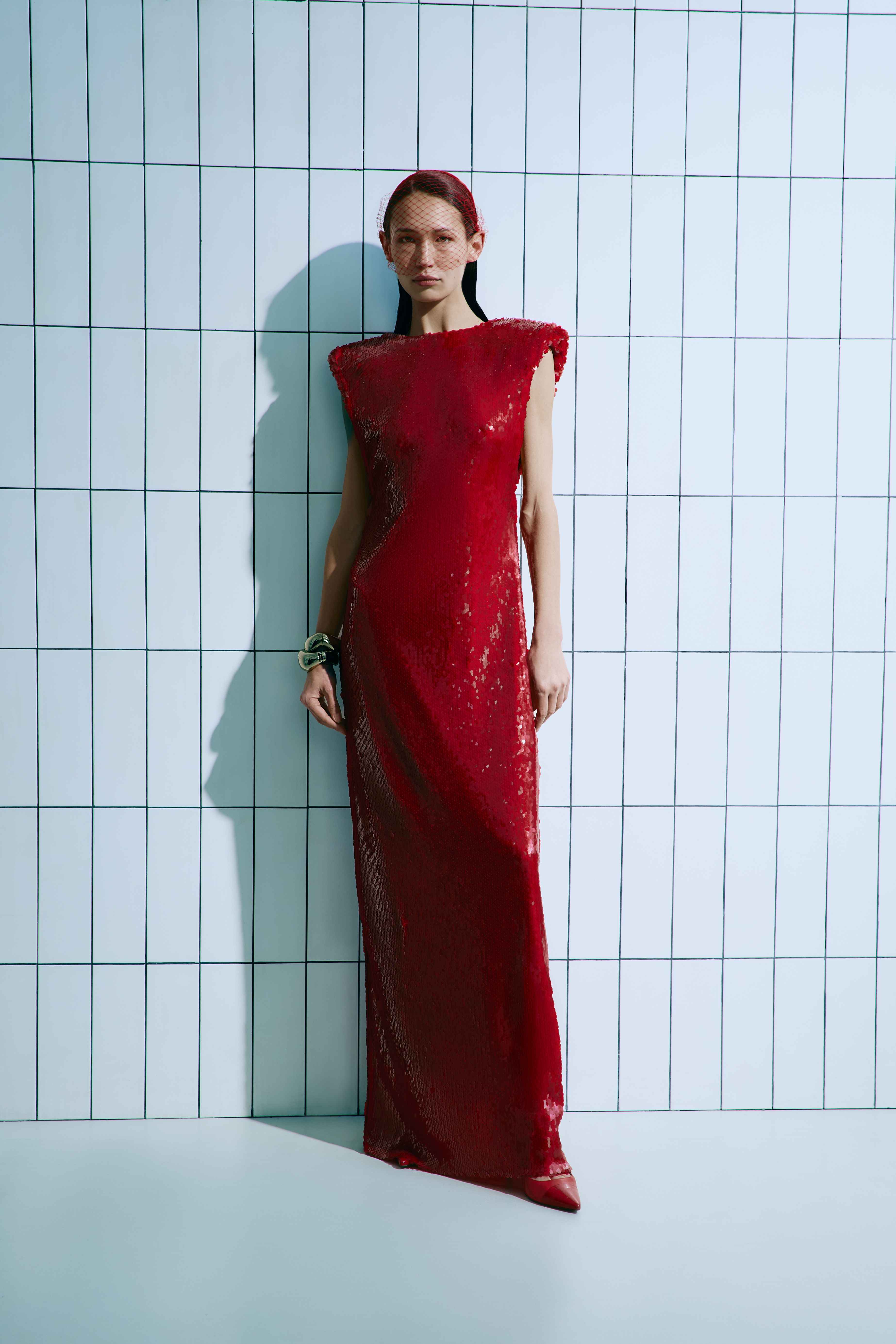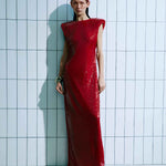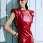Червона вечірня сукня максі з паєтками — виразний елемент святкового гардероба, створений для подій, де важлива присутність і стиль. Прямий силует м’яко підкреслює фігуру, а акцентовані плечі додають образу сучасної графічності та впевненості.