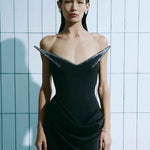 Чорна вечірня сукня з корсетним верхом — втілення сучасної елегантності та архітектурного крою. Виразна лінія декольте з акцентними плечовими елементами створює скульптурний силует, який підкреслює фігуру та додає образу витонченості.