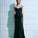 Драпірована спідниця м’яко рухається під час ходи, формуючи баланс між стриманою класикою та сучасною fashion-естетикою. Глибокий чорний відтінок підсилює драматичність образу та робить сукню ідеальним вибором для вечірніх подій, урочистих виходів і особливих occasions.