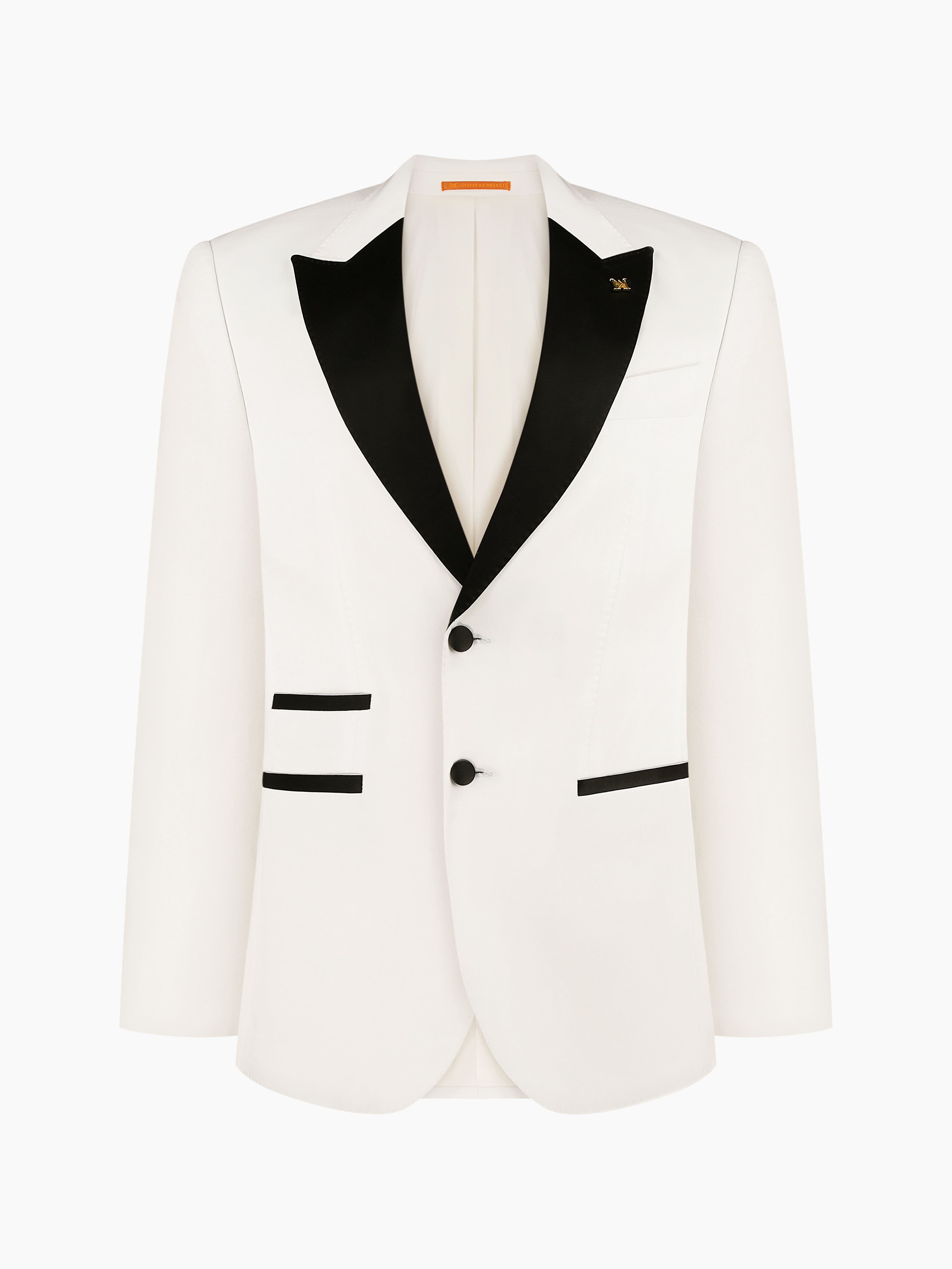 Піджак айворі із чорними лацканами зі смокінгового костюма — елегантне рішення для урочистих подій, весіль та вечірніх виходів. Контрастні чорні лацкани підкреслюють формальність образу та додають виразного акценту. Класичний однобортний крій забезпечує ідеальну посадку по фігурі та комфорт у носінні.
