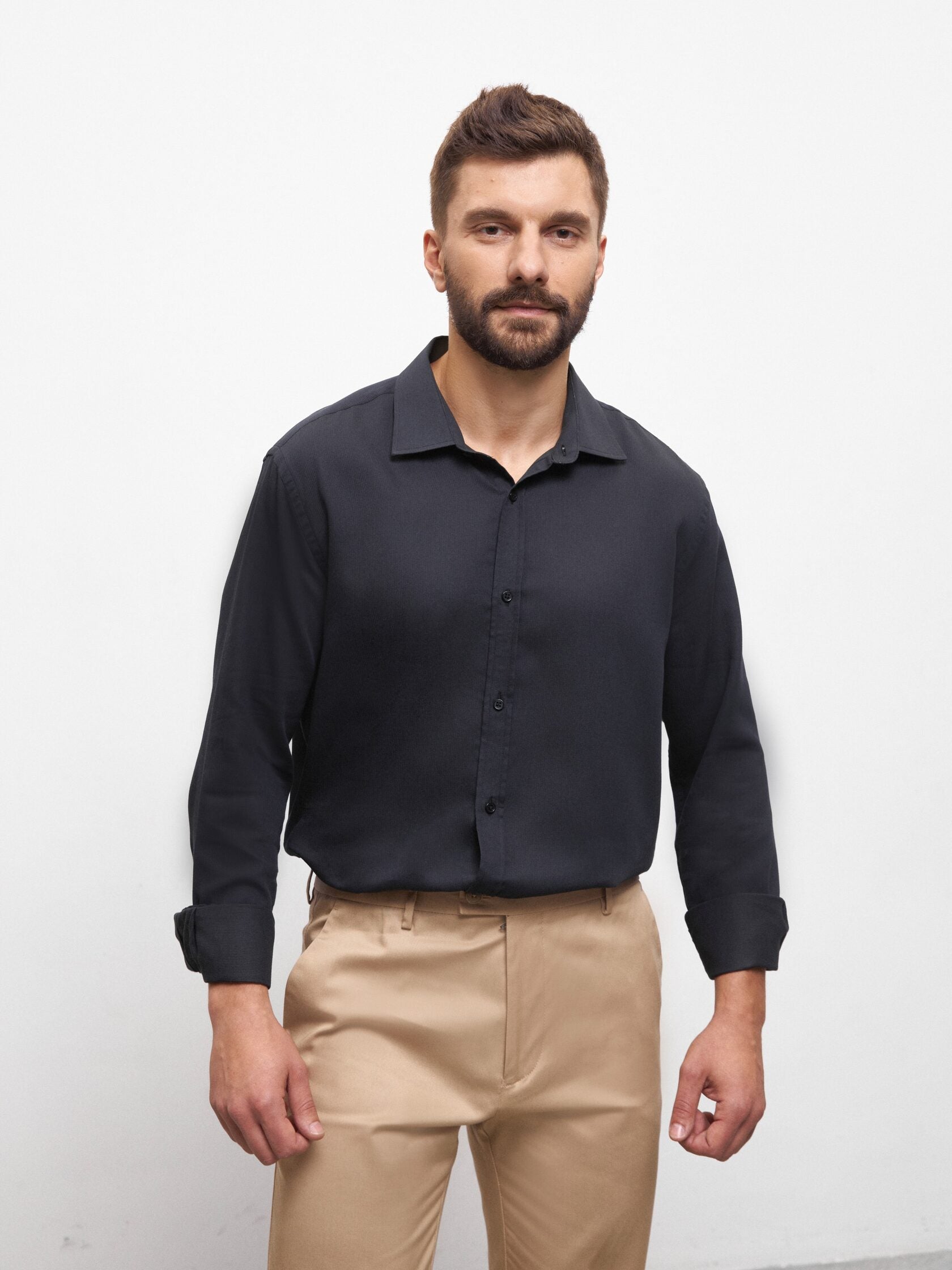 Завдяки універсальному крою сорочка легко поєднується як з класичним костюмом, так і з casual-образами. Преміальна італійська тканина зберігає форму та насиченість кольору навіть після тривалого носіння, що робить цю модель надійною основою щоденного стилю.