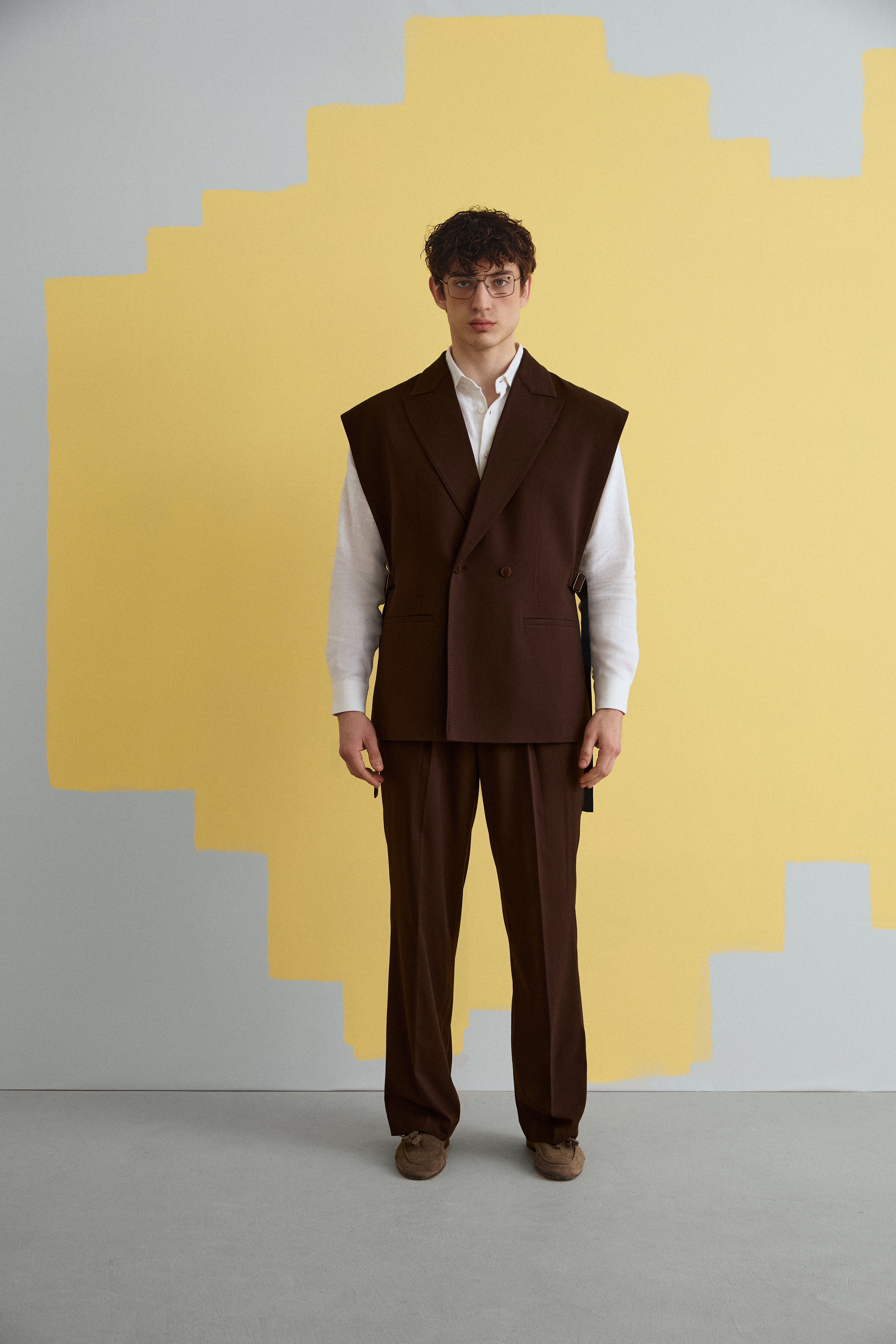 Чоловічий костюм Andreas Moskin — це поєднання сучасного tailoring та мінімалістичної преміум-естетики. Подовжений жилет із м’якою лінією плеча створює витончений силует, а чисті лінії штанів додають образу стриманої елегантності. Коричневий колір підкреслює універсальність костюму — він ідеально підходить як для вечірніх подій, fashion-івентів та урочистостей, так і для сучасного smart formal гардероба.