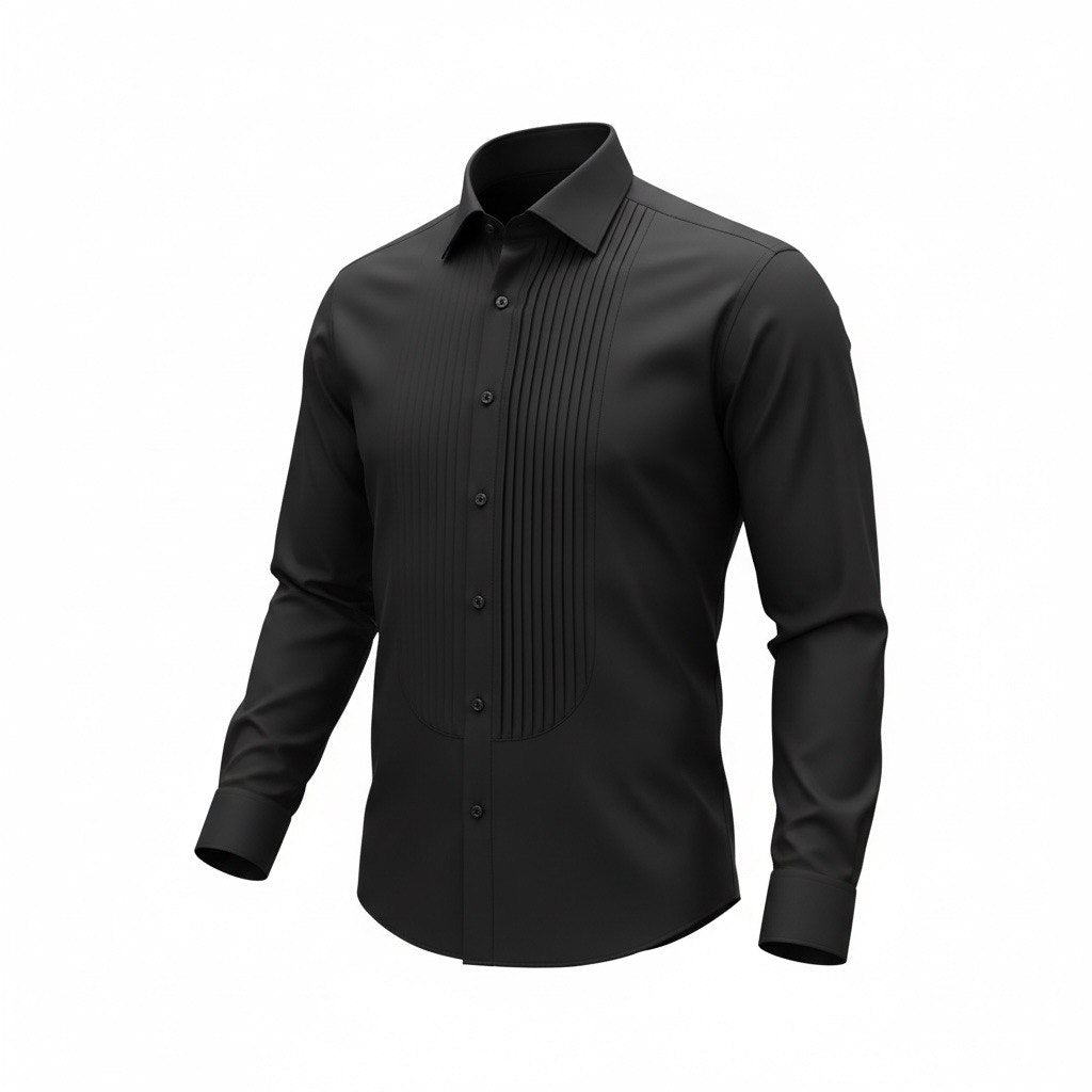 Black men’s tuxedo shirt with bow tie — a true embodiment of evening elegance and impeccable style. The classic cut with a decorative pleated front panel creates a distinctive formal accent, making it an ideal choice for special occasions, weddings, gala evenings, and official events.