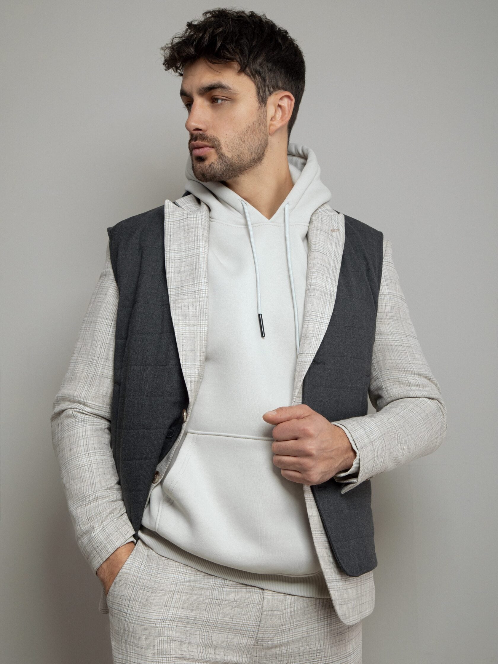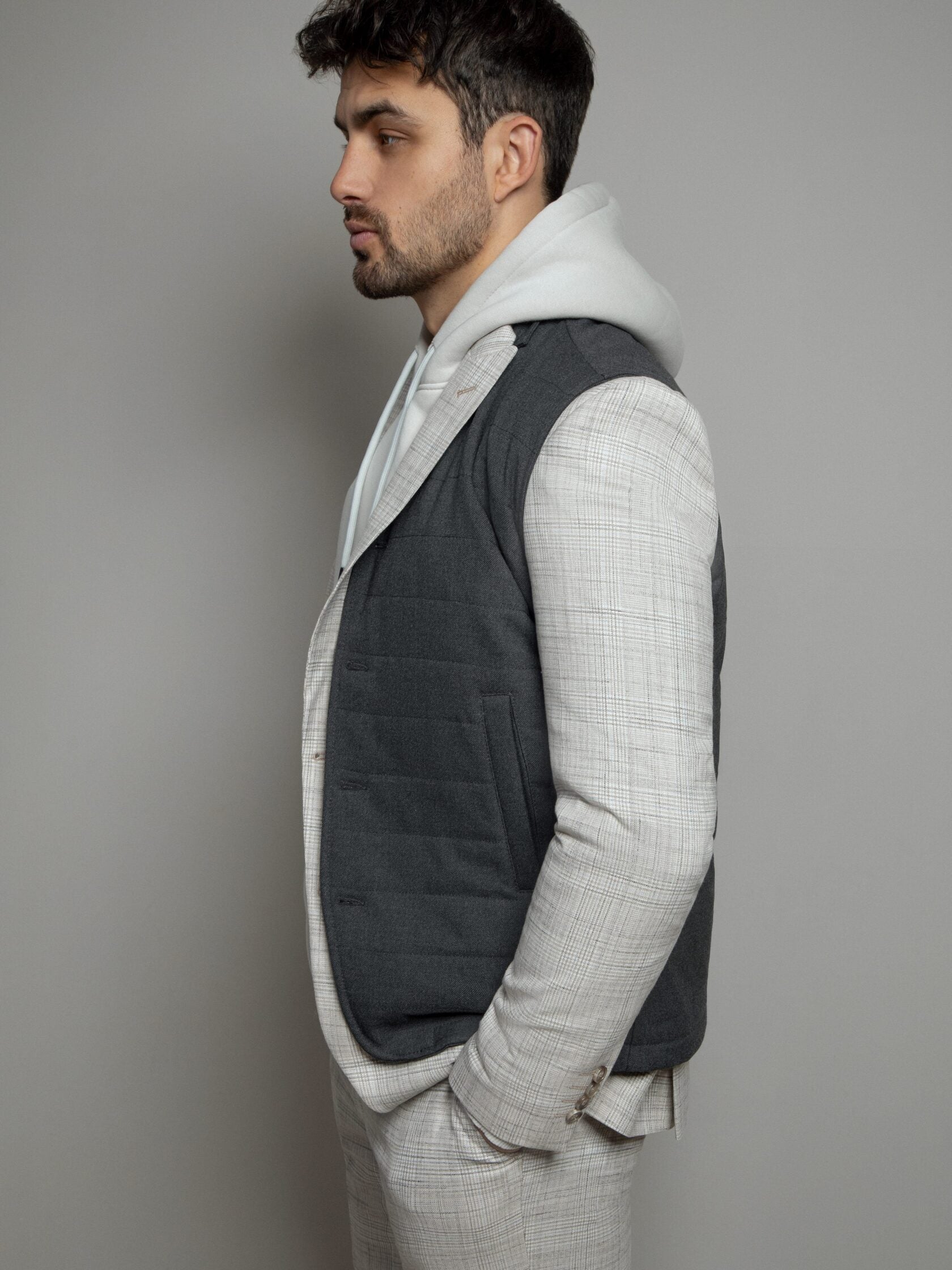 This grey vest is designed for men who appreciate elegance in every detail. Thanks to the combination of 65% wool, 34% viscose, 2% elastane, it has a noble matte shine, excellent thermoregulation and ease of wear.