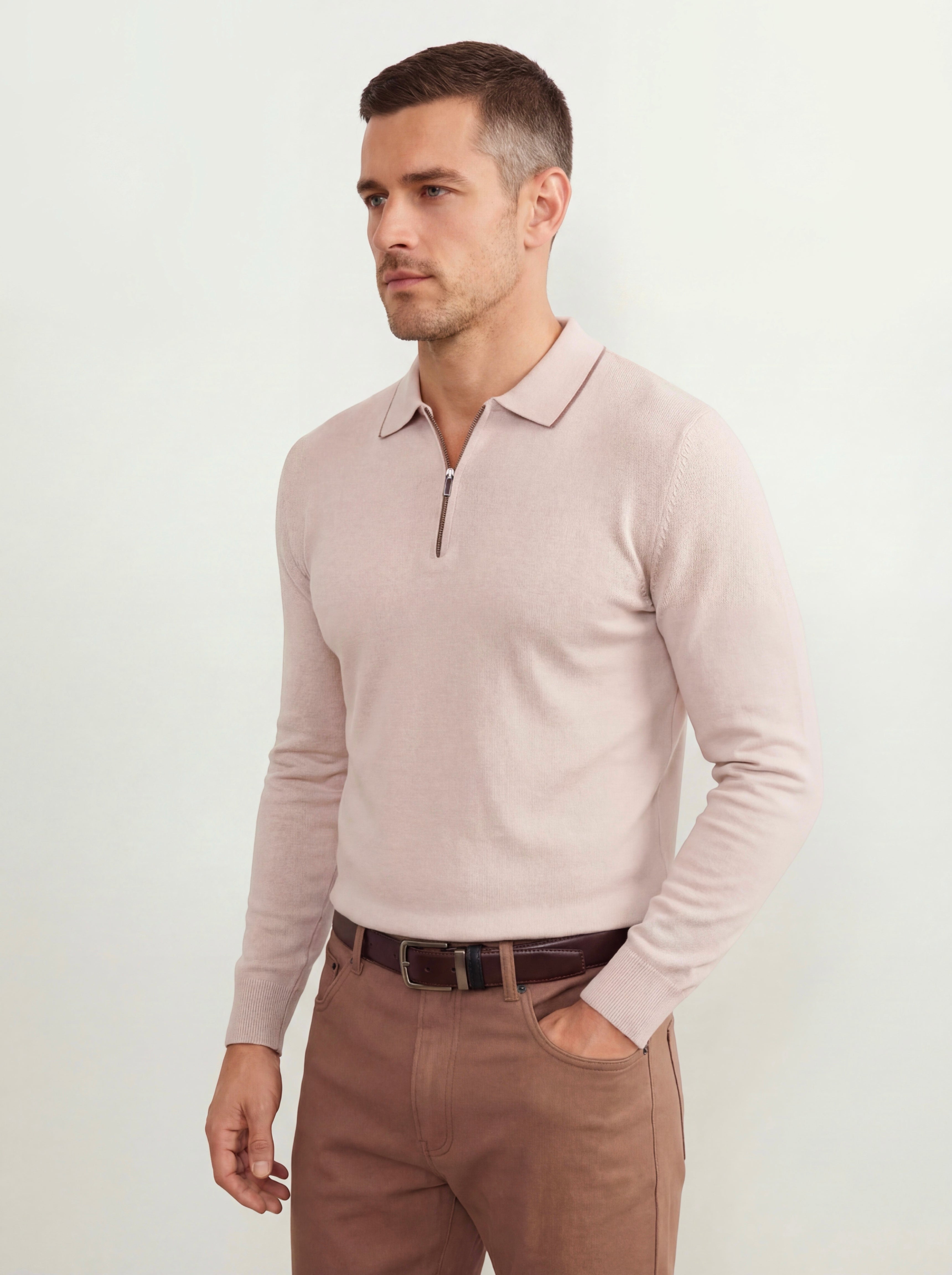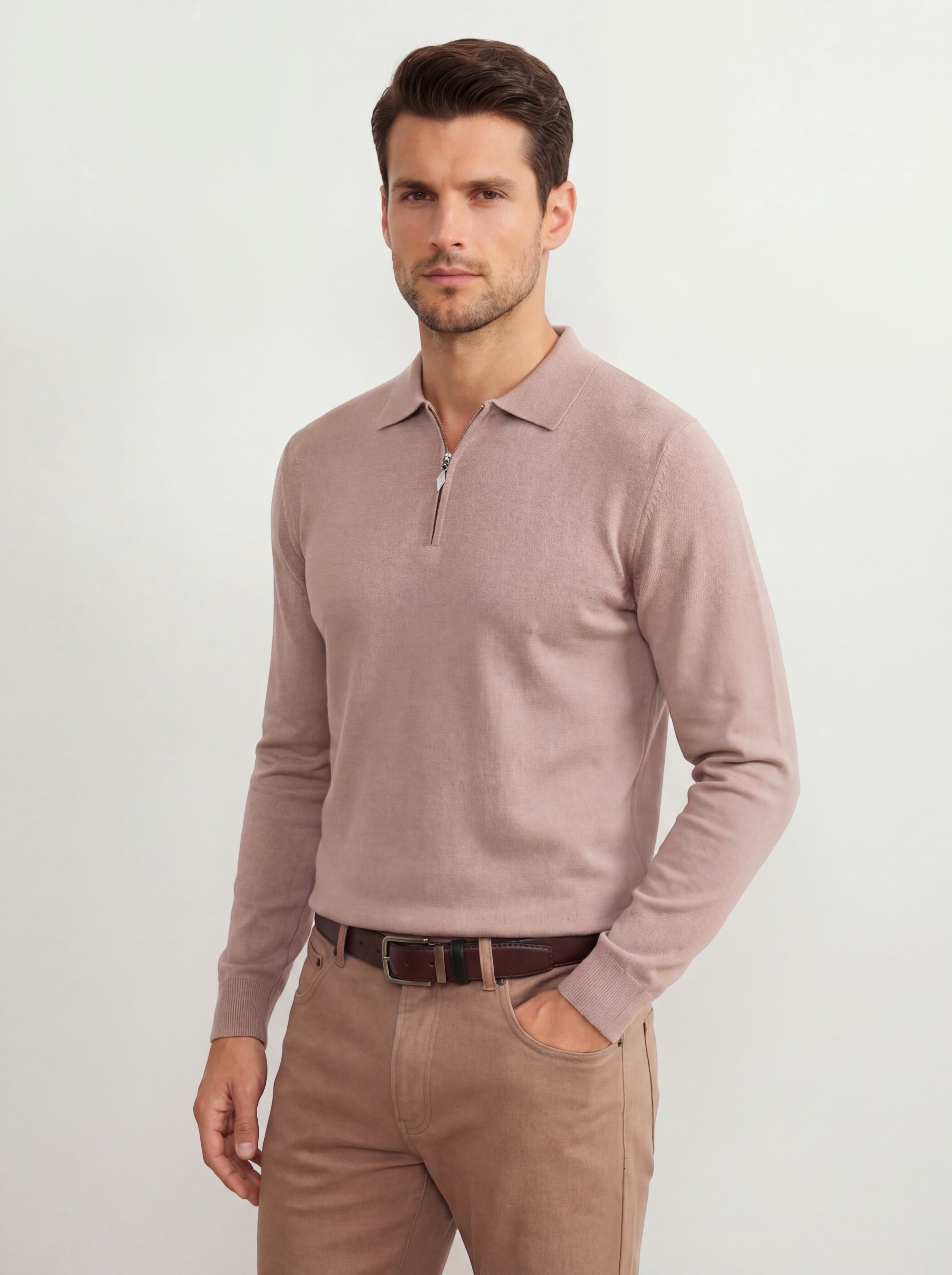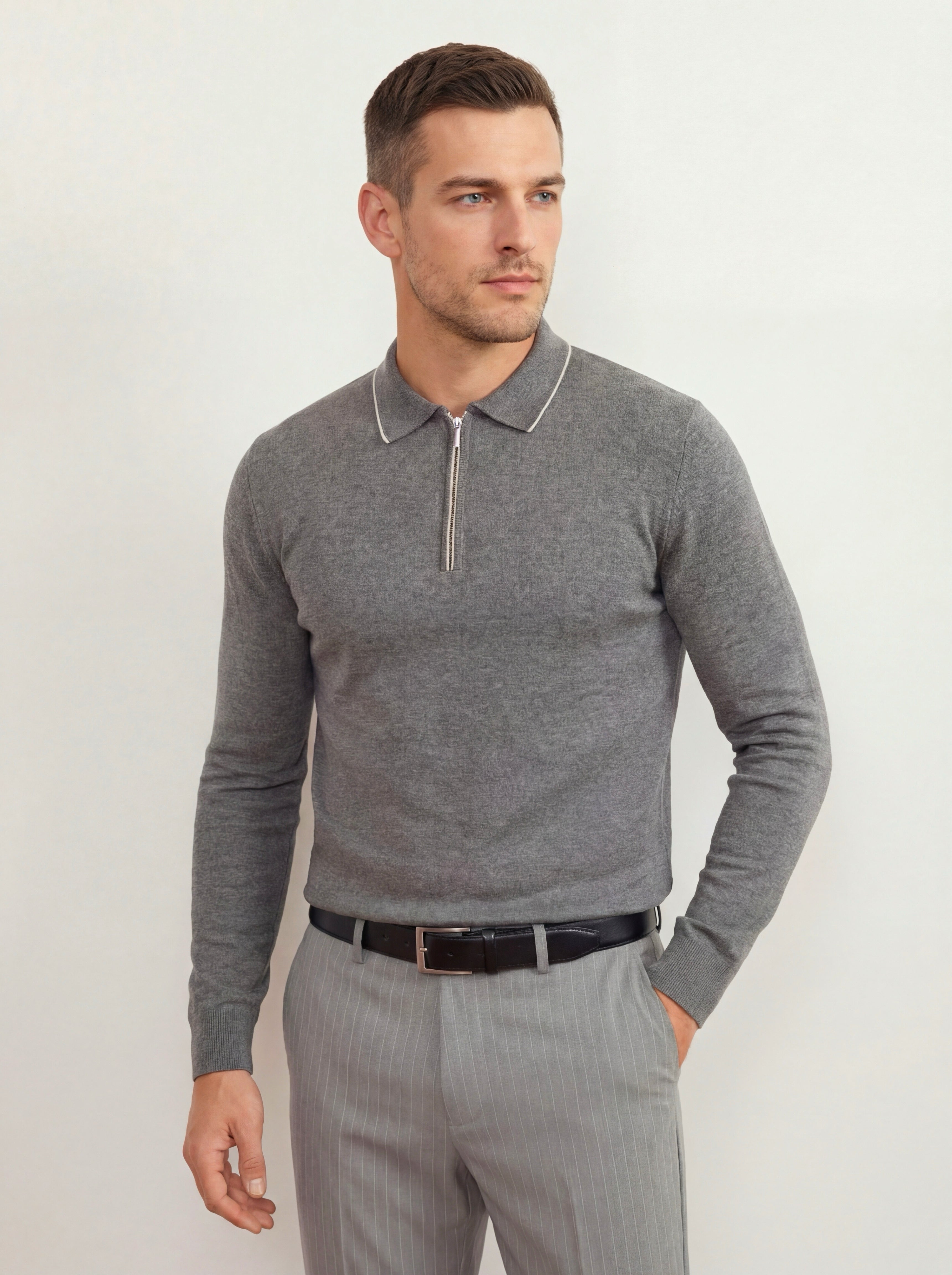 The minimalist design with a polo collar and a neat zipper adds a modern touch while preserving understated classic aesthetics. The sweater holds its shape perfectly, maintains its color, and looks impeccable both with classic trousers and within smart-casual outfits.