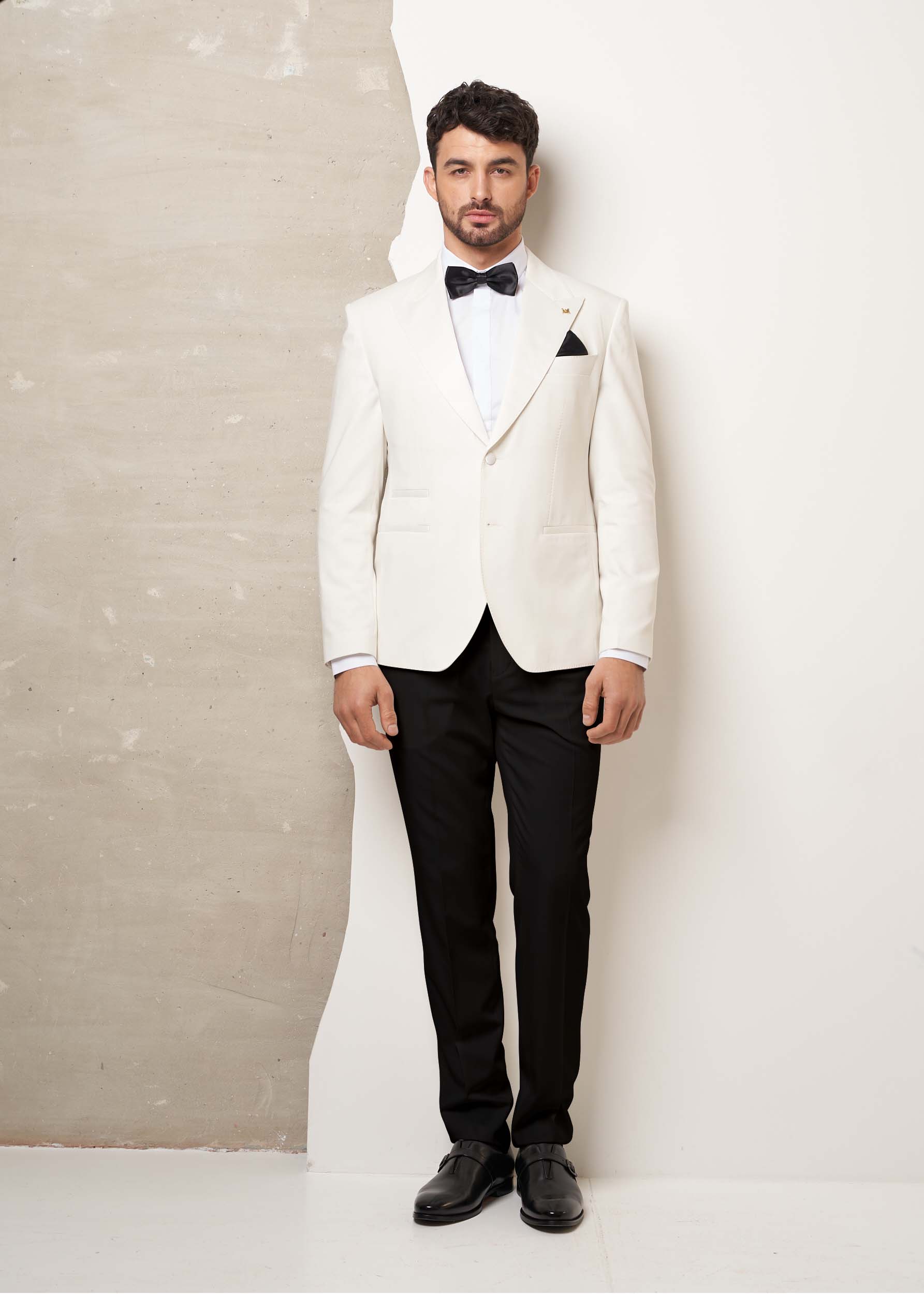 Ivory tuxedo with white peak lapels